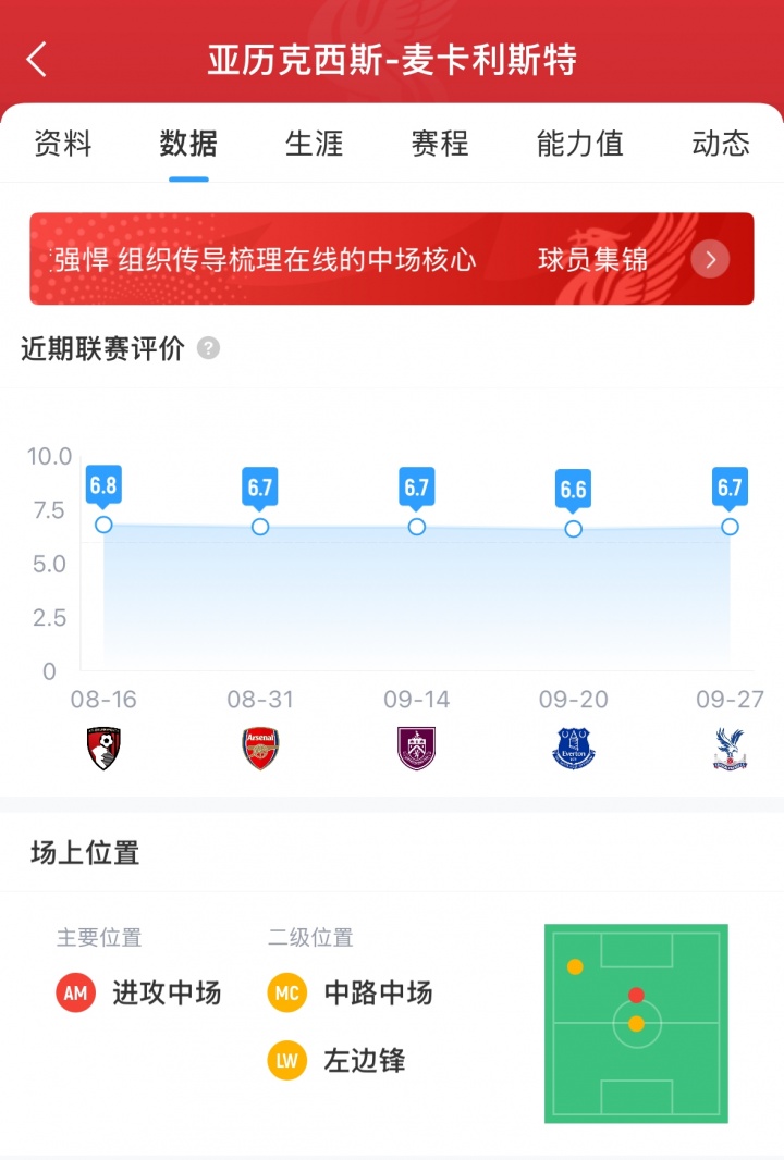 麦卡利斯特本赛季开赛后,发扬平平。现在2个月来的英超比赛以及两场欧冠比赛莫得一场媒体评分达到7分。