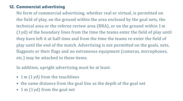 自球队入场起至上半场截至离场,以及自球队再次入场起至比赛全场截至时间,在比赛步地内、球网围挡区域内、本事区域、视频裁判操作区内,以及距步地规模线1米(1码)鸿沟内的大地上,均辞谢出现任何样式的生意告白(包括实体与杜撰告白)。球门、球网、角旗杆及旗面上亦不得诞生告白,且这些面目上不得附着任何外围修复(如录像机、麦克风等)。