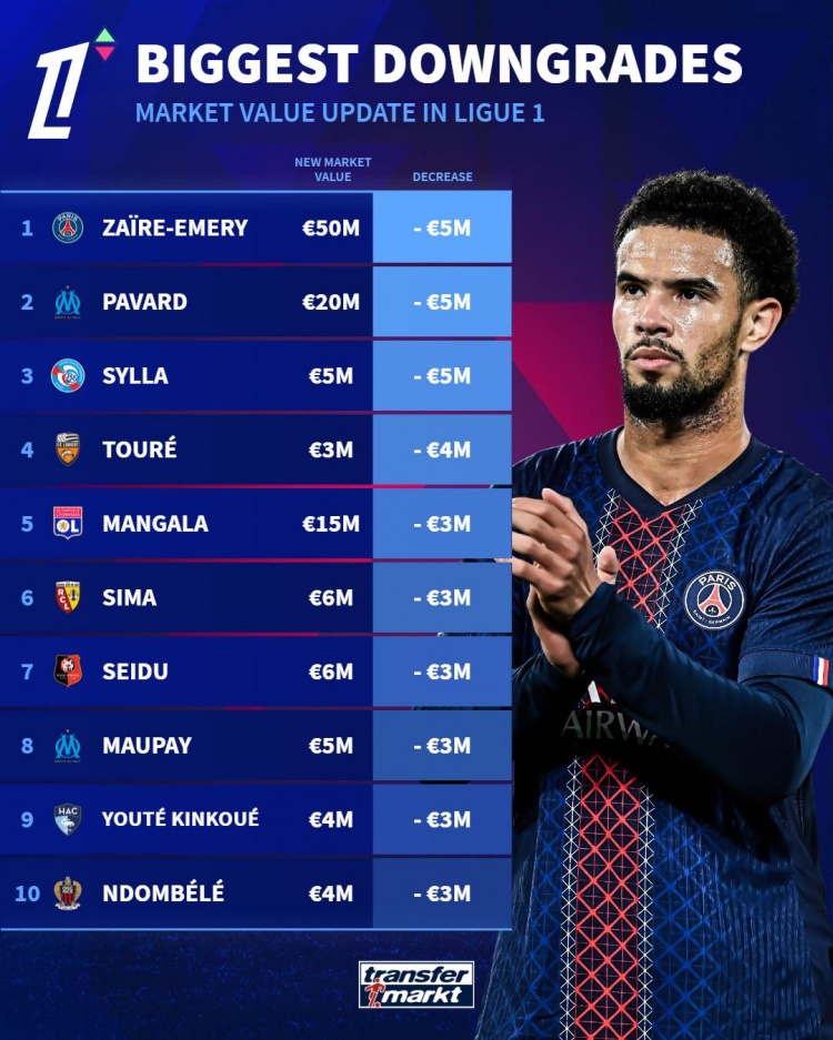 法甲球员身价下落榜:
