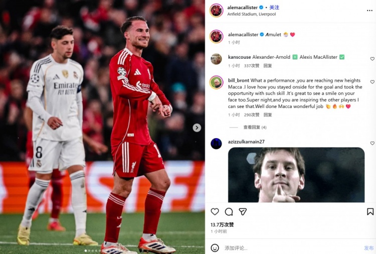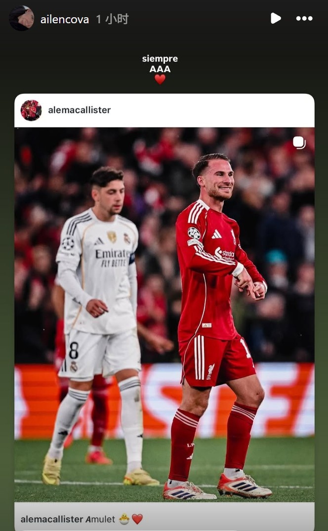女友也通过社媒用双关回话了麦卡的示爱:“AAA,遥远”(麦卡利斯特的名字亚历克西斯Alexis、女友名Ailén、两东说念主的孩子Alaia的首字母王人为A)。