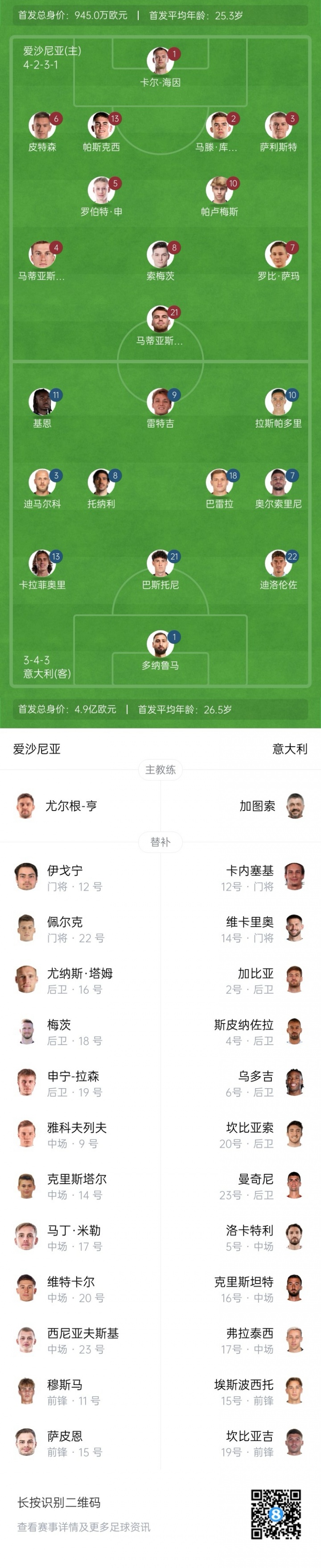 意大利首发:1-多纳鲁马、13-卡拉菲奥里、21-巴斯托尼、22-迪洛伦佐、3-迪马尔科、18-巴雷拉、8-托纳利、7-奥尔索里尼、9-雷特吉、10-拉斯帕多里、11-小基恩