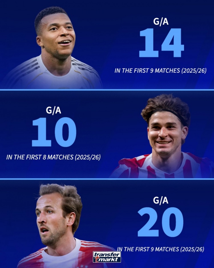 10月1日讯 德国转会市集列出凯恩、姆巴佩和阿尔瓦雷斯的紧迫数据,将三东说念主进行对比。