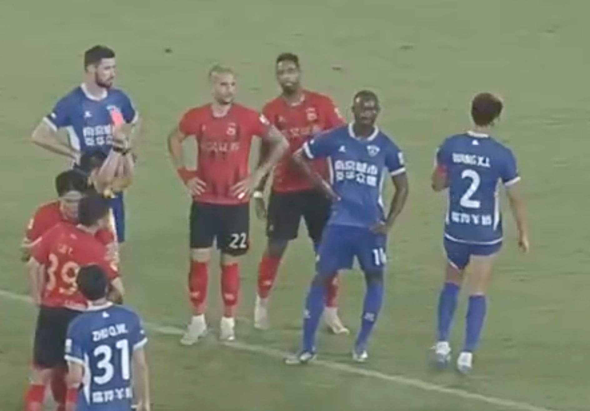随后,南京城市2号球员王夕杰向前,摸了陈骜的脸。其时,主裁判以为王夕杰是专诚寻衅,且疑似抽了陈骜的耳光。于是,主裁判出示红牌,将王夕杰罚出场。